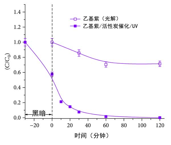 圖4:在紫外線照射下在活性炭催化劑存在下直接光解和乙基紫降解的曲線圖。
