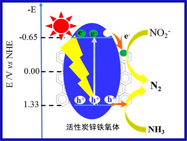 在紫外可見光照射下,基于活性炭鋅鐵氧體催化劑通過兩個(gè)步驟成功地同時(shí)去除亞硝酸鹽和氨。通過氣相色譜檢測產(chǎn)物表明在光催化過程中氮?dú)獗会尫懦鰜。XPS測量和鋅鐵氧體能帶結(jié)構(gòu)分析表明,鋅鐵氧體的還原電位低于亞硝酸鹽的還原電位,因此光生電子可以在照射下將亞硝酸鹽還原為氮?dú)。?duì)比下高于氨的電位,因此光生空穴可以將氨氧化成氮?dú)。活性炭引起帶隙的紅移,光生電子空穴對(duì)的分離,亞硝酸鹽和氨的吸附,促進(jìn)光催化活性。