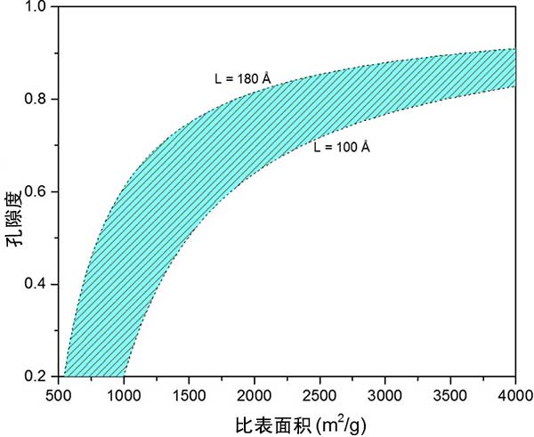 以前提出的活性炭微孔率模型將表面積和孔隙率作為兩個(gè)獨(dú)立變量處理。通過(guò)將石墨烯片的長(zhǎng)度限制在100和180之間,并通過(guò)改變石墨中石墨烯層的平均數(shù)量,我們計(jì)算孔隙率和比表面積之間的關(guān)系。圖2顯示了孔隙率和表面積之間的關(guān)系。