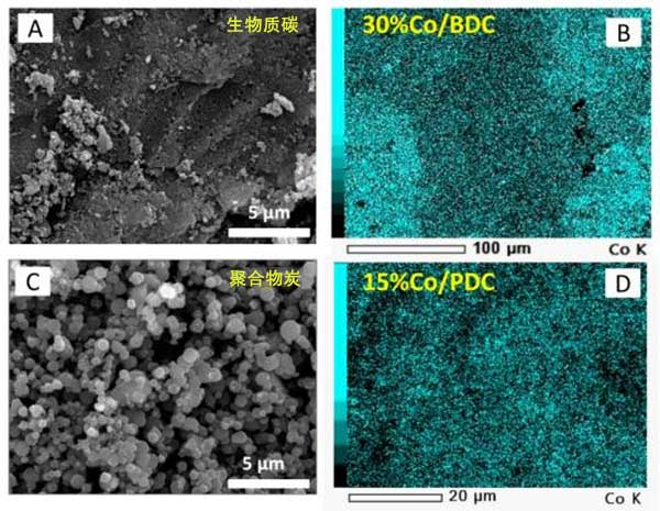 使用掃描電子顯微鏡(SEM)觀察由植物殼和酚醛樹脂的熱解獲得的活性炭的表面形態(tài),并分別在圖1A,C中示出?梢钥闯,不同的碳前體產生不同的表面形態(tài)。生物質衍生的碳顯示出剛性和致密的結構,這是典型的木炭特征。而聚合物衍生的碳呈現(xiàn)具有粒子網(wǎng)絡的碳球,在球體之間產生大的空隙。然后將兩種活性炭用作氧化鈷的載體。為了觀察金屬氧化物在活性炭上的分散,進行了SEM與能量色散X射線(EDX)的元素映射。圖1B,D表示裝載在兩種材料中的氧化鈷的代表。所有都顯示鈷材料(在青色中顯示)在活性炭中的均勻分散。這表明通過浸漬方法中描述的簡單化學計量計算很好地實現(xiàn)了元素鈷的目標負載。換句話說,上述結果清楚地顯示了制備氧化鈷活性炭的成功制備步驟。