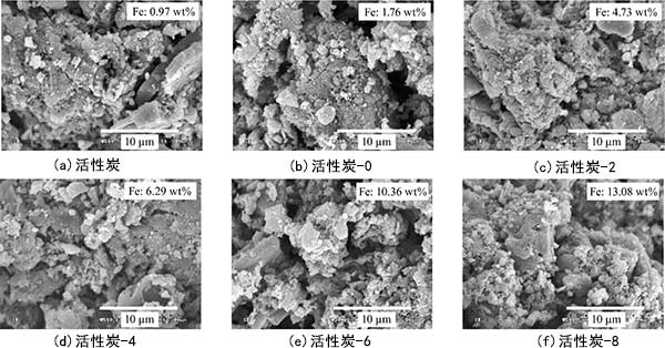 載鐵活性炭的SEM照片如圖1所示。載鐵活性炭具有片狀石墨填充結(jié)構(gòu)的表面形態(tài),其顯示產(chǎn)生大量微孔。對(duì)于所有活性炭,觀察到小的聚集體,其看起來(lái)更亮并且在活性炭的較暗表面上得到支撐。細(xì)氧化鐵顆粒傾向于覆蓋活性炭的表面而不是均勻地分散在整個(gè)表面上。作為四氧化三鐵的添加量增加,活性炭表面的聚集增加。通過(guò)能量分散X射線(EDX)分析(未顯示),證實(shí)聚集體是含鐵化合物。樣品的鐵含量顯示在圖1中每張圖的右上角。
