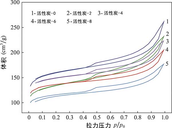 氮等溫線:圖2顯示了活性炭的氮吸附-解吸等溫線?梢钥闯,根據(jù)IUPAC分類(lèi),所有活性炭的等溫線屬于具有磁滯回線的Ⅳ型等溫線,表明活性炭具有中孔。隨著四氧化三鐵添加量的增加,活性炭的等溫線低于載鐵活性炭的等溫線,表明比表面積減小,孔隙增大。