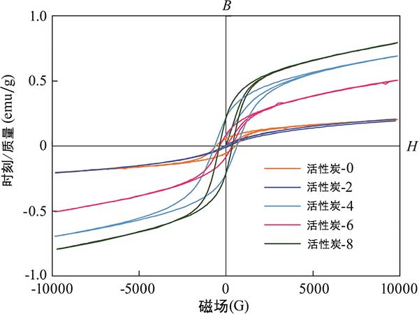 活性炭的磁滯回線如圖3所示。隨著鐵含量增加,活性炭的飽和磁化強(qiáng)度首先降低并隨后增加;钚蕴康娘柡痛呕瘡(qiáng)度值與活性炭中殘留的四氧化三鐵和金屬鐵的量有關(guān),因?yàn)樗鼈兙哂写判?yīng);钚蕴康奶囟ù呕适谴欧蛛x的重要參數(shù)之一。