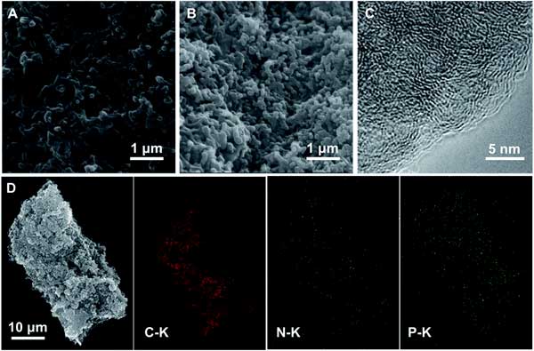 圖1:活性炭的高分辨率TEM圖像SEM和元素映射圖像,碳,氮和磷的元素映射圖像表明元素的均勻分布。