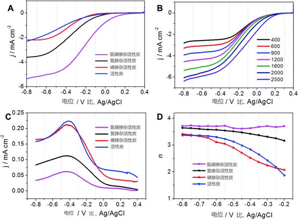 活性炭樣品通過兩步法制備,包括原位氧化聚合和高溫熱解。這里,苯胺和植酸分別用作氮源和磷源。為了研究氮磷碳比對活性炭的氧化還原電催化活性的影響,在中性介質中進行循環(huán)伏安圖。旋轉圓盤電極伏安圖在氧飽和的50mM磷酸鹽緩沖溶液中進行,結果顯示在圖2A中。在摻雜碳改性后,活性炭基催化劑的起始電位顯示出從0V到+0.22V的大的正向偏移,氧化還原電流密度也大大增加。此外,由共摻雜碳改性的活性炭電催化活性優(yōu)于由單摻雜碳改性的活性炭電催化活性。在進行旋轉環(huán)盤電極測量以研究不同催化劑的過氧化氫的產(chǎn)生(圖2C)。正如預期的那樣,氮磷摻雜活性炭顯示出比其他催化劑更低的過氧化氫產(chǎn)生。可以看出,氮磷摻雜活性炭在氧化還原起始電位和高電流電流方面對氧化還原具有優(yōu)異的電催化活性,突出了N,P共摻雜和中孔結構對氧化還原的重要性。
