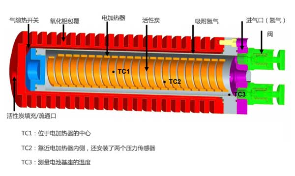 排出壓力約為3.5MPa的實(shí)驗(yàn)結(jié)果如圖4所示。250秒后,加熱功率為500W,中心溫度超過(guò)476℃,而電池底座溫度則為76℃。然而,將電池達(dá)到其穩(wěn)態(tài)溫度分布需要大約60分鐘,其中電池基座中的溫度為166℃。活性炭的溫度不允許超過(guò)526℃。 60分鐘,加熱功率逐漸降低,以保持最高溫度低于526℃,壓力高于3.5MPa。由于電池基座的溫升速率隨時(shí)間降低,輸送的氮量也減少了。因此,在15分鐘后結(jié)束放電階段僅從活性炭吸附池釋放4.6g氮。圖4中的冷卻階段持續(xù)約100分鐘,并且如果放電階段在15分鐘后結(jié)束(此時(shí)基礎(chǔ)溫度僅為126℃),則可以減少冷卻階段;钚蕴恐械募訜岷屠鋮s速率以及溫度分布與數(shù)值分析估計(jì)的相似。這表明簡(jiǎn)化的數(shù)值傳熱分析為吸附池中的傳熱提供了令人滿意的估計(jì)。