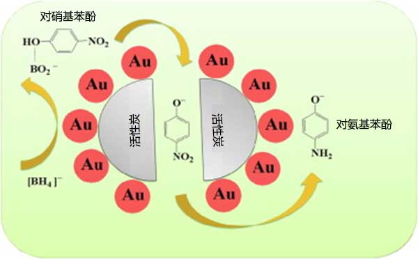 圖2:對硝基苯酚與對氨基苯酚與活性炭載金納米催化劑還原反應(yīng)的示意圖。
