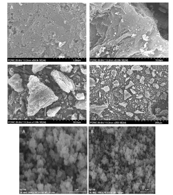 圖1呈現(xiàn)活性炭的掃描電子顯微鏡(SEM)圖像,其示出了活性炭的結(jié)構(gòu)和表面表征。圖像顯示碳顆粒的平均尺寸為約20nm,并且這些顆粒聚集在一起并形成平均尺寸為25μm的角形簇。孔隙率為17.78%。可以看出簇的表面是平坦的,粗糙的和多孔的。最后兩幅顯示的活性炭摻雜二氧化鈦的圖像。在嚴(yán)格攪拌下,將丁醇鈦溶液加入到含有活性炭的擬均勻溶液中,可能形成二氧化鈦,其中活性炭顆粒將其裝飾。