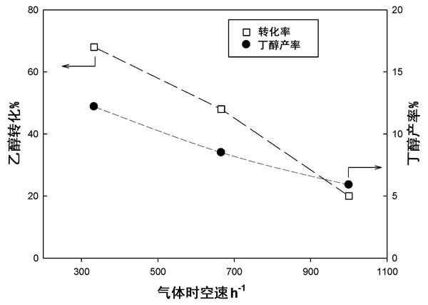 通過改變反應(yīng)器中的活性炭負(fù)載量,同時(shí)保持總流速和入口乙醇濃度不變,在400°C下初步研究了氣體時(shí)空速度對(duì)20%活性炭負(fù)載氧化鎂樣品的影響。結(jié)果以乙醇轉(zhuǎn)化率和丁醇產(chǎn)率報(bào)告于圖3。正如預(yù)期的那樣,乙醇轉(zhuǎn)化率通過降低氣體時(shí)空速度而增加。值得注意的是,對(duì)于較低的氣體時(shí)空速度值,制得丁醇的產(chǎn)率也增加。應(yīng)該注意的是,在我們的實(shí)驗(yàn)中負(fù)載的最大催化劑量(1克)對(duì)應(yīng)于約3厘米的催化床高度。更長(zhǎng)的催化劑床層將超過電爐的等溫區(qū),因此,未探索出較低的氣體時(shí)空速度值。另一方面,即使使用較大可能劑量的催化劑,在350°C下進(jìn)行測(cè)試所得到的丁醇產(chǎn)量也可忽略不計(jì)。