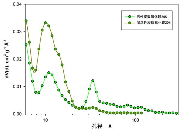 初步的TG分析20%氧化鎂負(fù)載量的活性炭與釋放的氣體進(jìn)行IR分析表明,硝酸鹽的分解在400°C以下完成。在此溫度以上,僅發(fā)生了Mg(OH)2緩慢轉(zhuǎn)變?yōu)镸gO的情況。因此,所有在600°C下處理過的催化劑均由分散在活性炭上的MgO組成,而沒有硝酸鹽前體鹽的殘留。圖1報(bào)告了不同負(fù)載下的活性炭和負(fù)載了氧化鎂的活性炭催化劑的孔徑分布(PSD)。