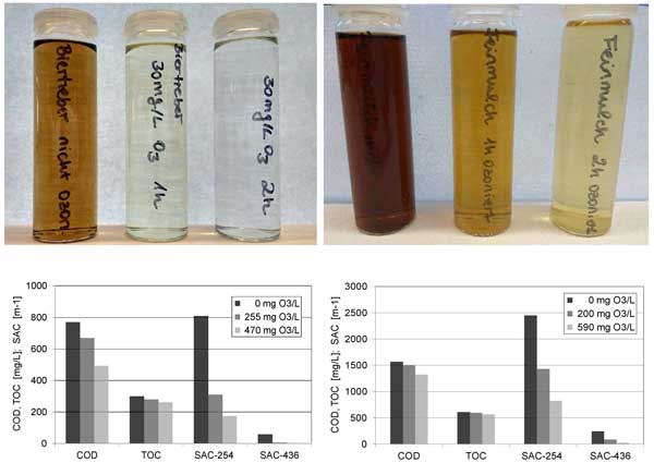 圖2:經(jīng)過臭氧化處理對預(yù)處理的水熱碳化用過的纖維廢水(左)和細(xì)覆蓋廢水(右)的影響。