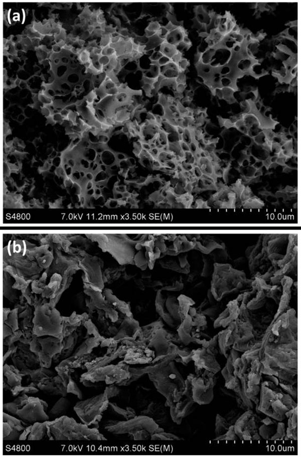 圖1:(a)化學活化活性炭和(b)物理活化活性炭樣品的SEM顯微照片。
