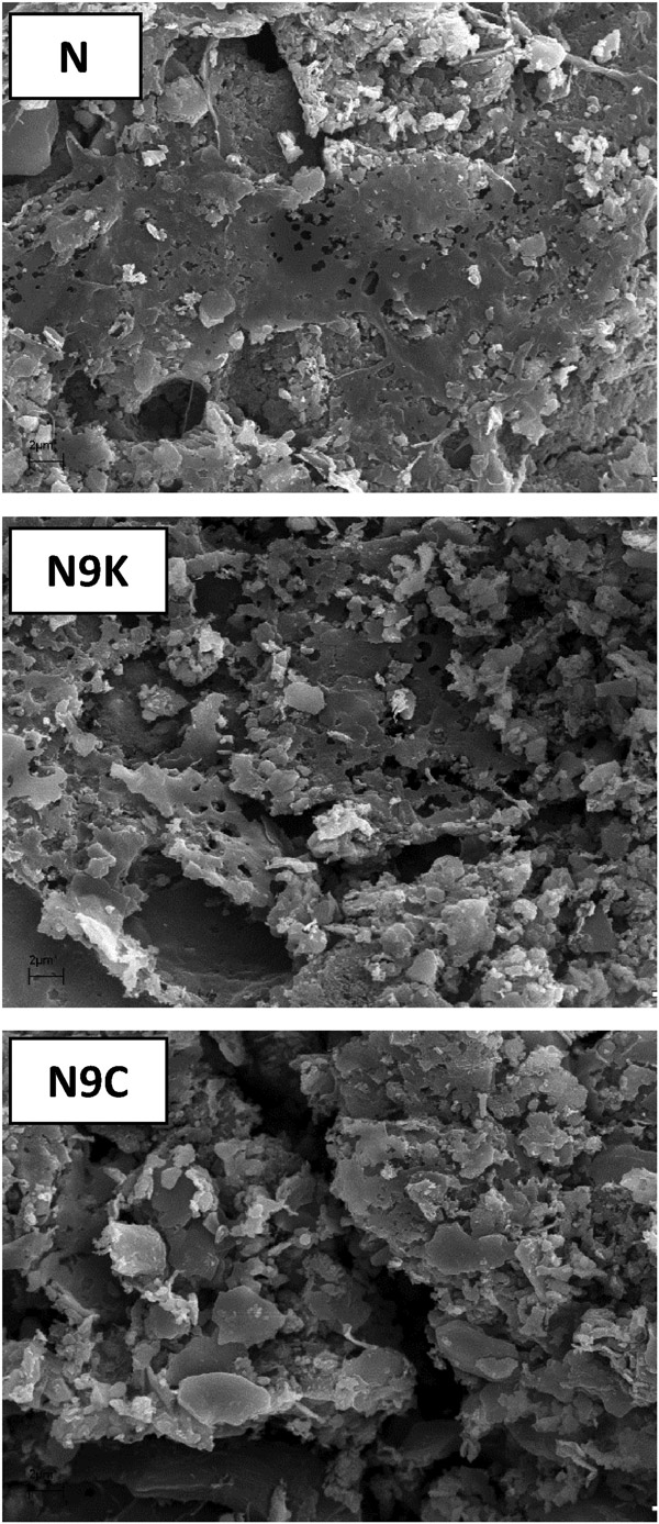 活性炭和經(jīng)改性后獲得的樣品的化學(xué)成分。兩種修飾均導(dǎo)致灰分含量以及結(jié)構(gòu)中特定元素的變化,其中這些變化對N9K樣品而言更大。起始活性炭(N)暴露于碳酸鉀會導(dǎo)致礦物質(zhì)(灰分)的顯著下降,同時氫含量下降兩倍(可能是碳結(jié)構(gòu)芳構(gòu)化的結(jié)果)由于活性炭顆粒的表面氧化,增加了氧氣量。還值得注意的是,灰分含量比在CO 2中退火的N9C樣品低了近10倍。大氣層。N9K中的灰分很可能是由于活化后將其用5%的鹽酸溶液洗滌而導(dǎo)致的。圖1所示的SEM圖像也證實了各個活性炭的質(zhì)地和形態(tài)多樣性?梢钥闯,根據(jù)制備程序,樣品在尺寸,形狀以及孔的數(shù)量或排列方面存在顯著差異。特別是在活性炭和N9C樣品中可以觀察到的較亮片段可能是其結(jié)構(gòu)中存在灰分(礦物質(zhì))的結(jié)果。