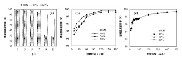 溶液PH影響活性炭的表面電荷。因此,它是控制活性炭吸附過程的重要因素之一。圖2(a)中描述了萘酚藍(lán)黑在以40%,50%和60%的活化劑制備的活性炭上的吸附。在所研究的pH范圍內(nèi)(pH介于1和11之間),萘酚藍(lán)黑在活性炭上的吸附是pH依賴性的,尤其是在pH 5和11之間。在低pH值下,活性炭表面帶有凈正電荷。pH的增加導(dǎo)致凈正電荷的減少和凈負(fù)電荷的增加。萘酚藍(lán)黑是具有負(fù)電荷的陰離子染料。在pH值為3時,它會在活性炭表面的活性位點(即,官能團)與被吸附物分子(即,萘酚藍(lán)黑)之間引起靜電吸引;钚蕴康幕钚圆课慌c萘酚藍(lán)黑色分子之間的靜電排斥作用占主導(dǎo)。因此,可以得出結(jié)論,將萘酚藍(lán)黑色吸附到活性炭上的pH值選擇為3。另一方面,使用60%活化劑的活性炭吸附時,萘酚藍(lán)黑的吸附量比使用40%活化劑活化的活性炭吸附的高,這是由于活性炭產(chǎn)生了更多的孔,盡管在pH 1-3下差異不明顯。
