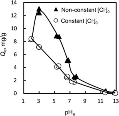 活性炭上的硝酸根離子吸附量與溶液的pH e之間的關(guān)系如圖1所示。硝酸根離子在堿性條件下幾乎不被吸附,這意味著氫氧根離子會抑制硝酸根離子的吸附。另一方面,隨著平衡pH的降低,硝酸根離子的吸附量增加。在堿性條件下,由于硝酸根離子與活性炭表面之間的靜電排斥,硝酸根離子很難被吸附在活性炭上。另一方面,硝酸根離子的吸附量在酸性條件下增加,這歸因于硝酸根離子與碳表面之間的靜電吸引力。然而,隨著平衡pH從3.0降低到2.0,觀察到硝酸根離子吸附的顯著降低。在此pH范圍內(nèi),氯離子的初始濃度從2 m增加到20 m M,這意味著共存的氯離子會抑制硝酸根離子的吸附。通過NaCl溶液將氯離子的初始濃度固定在20 m M時,可以清楚地發(fā)現(xiàn)氯離子對硝酸根離子的吸附抑制作用,表明硝酸根離子在所有pH區(qū)域的吸附量均低于沒有任何pH調(diào)節(jié)的溶液。因此共存陰離子會導(dǎo)致競爭吸附影響硝酸根離子吸附的效果,并且這種作用可能是較強的在共存陰離子的濃度較高。