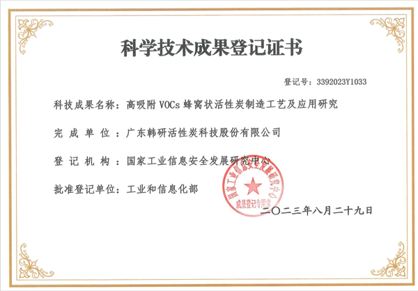 本次科學(xué)技術(shù)成果鑒定由國(guó)家工業(yè)信息安全發(fā)展研究中心依據(jù)《中華人民共和國(guó)科學(xué)技術(shù)進(jìn)步法》、《中華人民共和國(guó)促進(jìn)科技成果轉(zhuǎn)化法》、《科學(xué)技術(shù)評(píng)價(jià)辦法》、《科技評(píng)估管理暫行辦法》,在北京主持召開由韓研股份研發(fā)的“高吸附 VOCs 蜂窩狀活性炭制造工藝及應(yīng)用研究”科技成果評(píng)價(jià)會(huì)。期間嚴(yán)格按照《科技成果評(píng)價(jià)試點(diǎn)暫行辦法》的有關(guān)規(guī)定和要求,秉承客觀、公正、獨(dú)立的原則,聘請(qǐng)專家對(duì)該項(xiàng)科技成果進(jìn)行評(píng)價(jià)。評(píng)價(jià)委員會(huì)聽取了項(xiàng)目完成單位的技術(shù)總結(jié)報(bào)告,對(duì)評(píng)價(jià)資料進(jìn)行了審查,經(jīng)嚴(yán)格質(zhì)詢和充分討論形成一致意見(jiàn):本技術(shù)成果達(dá)國(guó)際先進(jìn)水平。